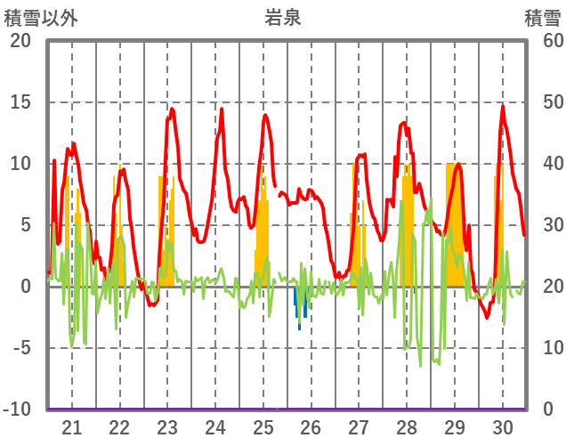 | 日 | 時 | 気温 | 降水 | 風向/風速 | 日照 | 積雪 | 降雪 |