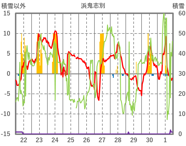 | 日 | 時 | 気温 | 降水 | 風向/風速 | 日照 | 積雪 | 降雪 |
