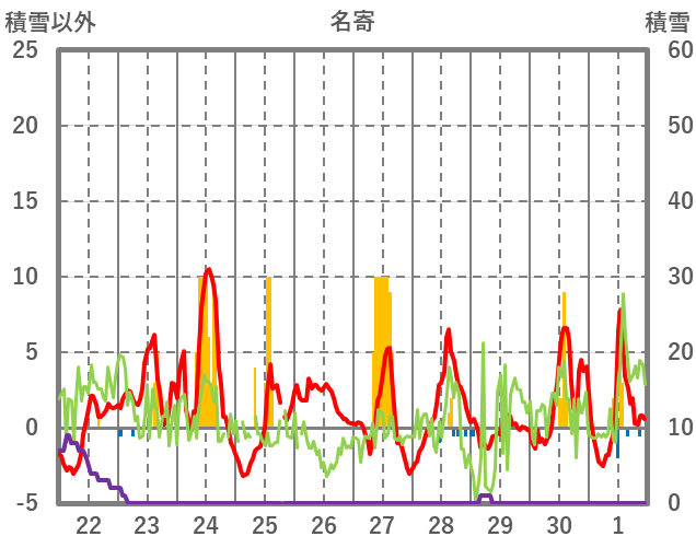 | 日 | 時 | 気温 | 降水 | 風向/風速 | 日照 | 積雪 | 降雪 |