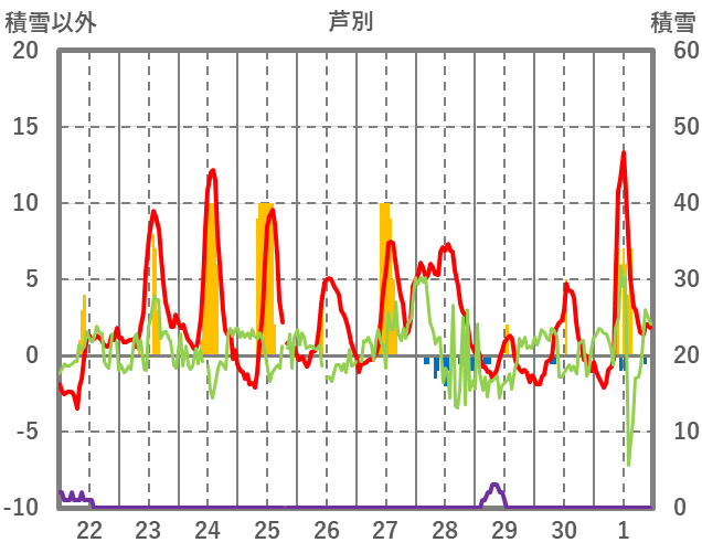 | 日 | 時 | 気温 | 降水 | 風向/風速 | 日照 | 積雪 | 降雪 |