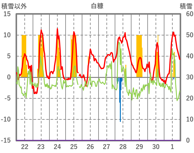 | 日 | 時 | 気温 | 降水 | 風向/風速 | 日照 | 積雪 | 降雪 |