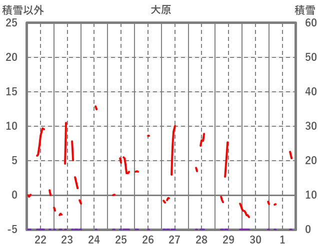 | 日 | 時 | 気温 | 降水 | 風向/風速 | 日照 | 積雪 | 降雪 |