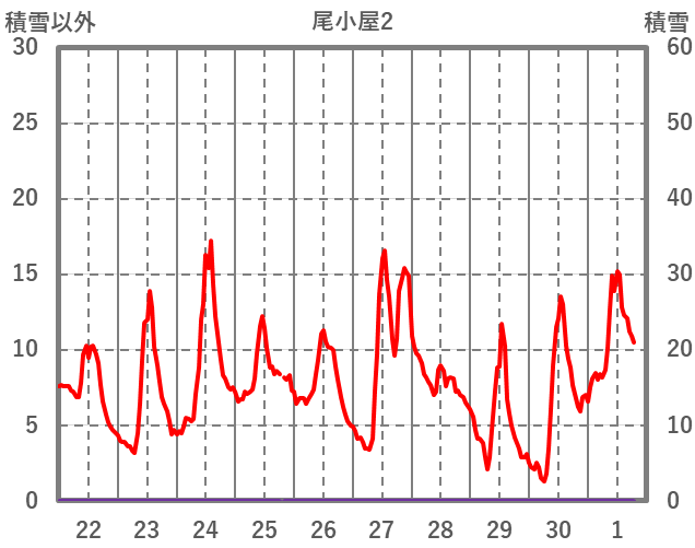 | 日 | 時 | 気温 | 降水 | 風向/風速 | 日照 | 積雪 | 降雪 |