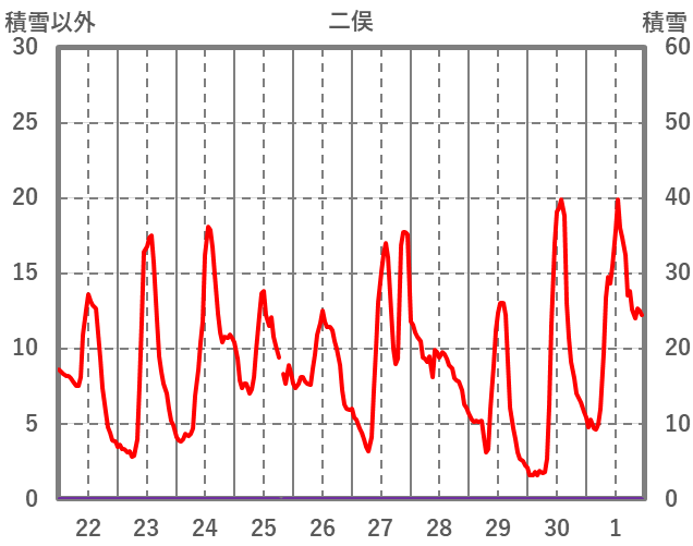 | 日 | 時 | 気温 | 降水 | 風向/風速 | 日照 | 積雪 | 降雪 |