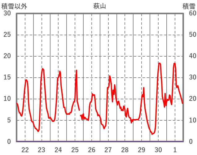 | 日 | 時 | 気温 | 降水 | 風向/風速 | 日照 | 積雪 | 降雪 |