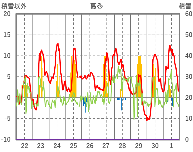 | 日 | 時 | 気温 | 降水 | 風向/風速 | 日照 | 積雪 | 降雪 |