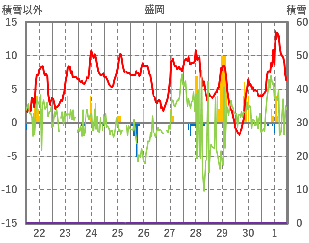 | 日 | 時 | 気温 | 降水 | 風向/風速 | 日照 | 積雪 | 降雪 |