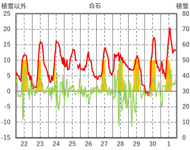 | 日 | 時 | 気温 | 降水 | 風向/風速 | 日照 | 積雪 | 降雪 |