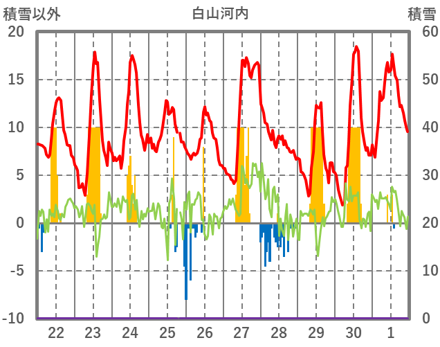 | 日 | 時 | 気温 | 降水 | 風向/風速 | 日照 | 積雪 | 降雪 |