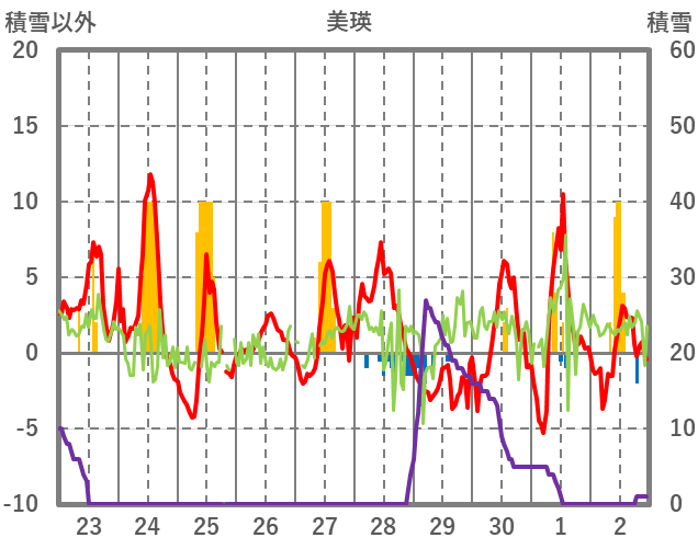 | 日 | 時 | 気温 | 降水 | 風向/風速 | 日照 | 積雪 | 降雪 |