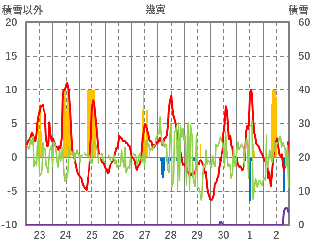| 日 | 時 | 気温 | 降水 | 風向/風速 | 日照 | 積雪 | 降雪 |