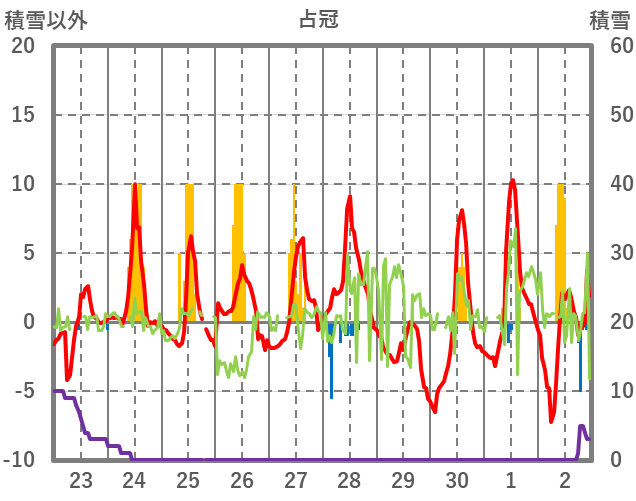 | 日 | 時 | 気温 | 降水 | 風向/風速 | 日照 | 積雪 | 降雪 |