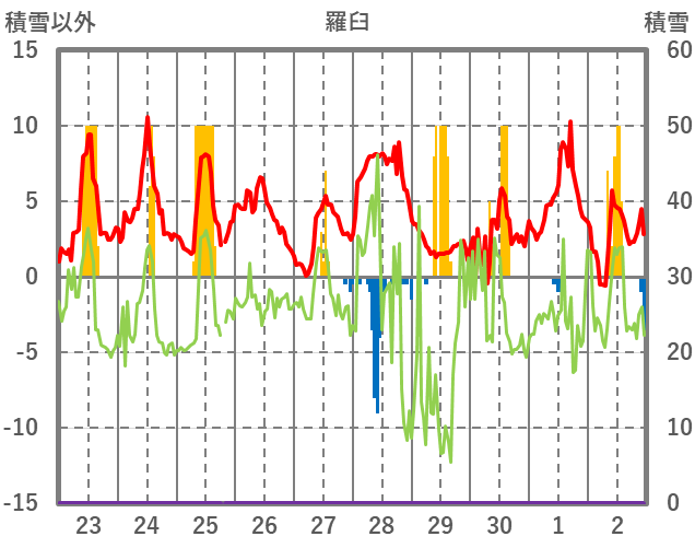 | 日 | 時 | 気温 | 降水 | 風向/風速 | 日照 | 積雪 | 降雪 |