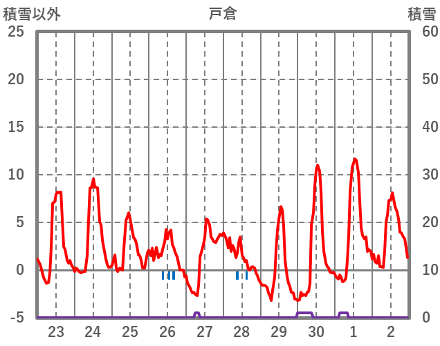 | 日 | 時 | 気温 | 降水 | 風向/風速 | 日照 | 積雪 | 降雪 |
