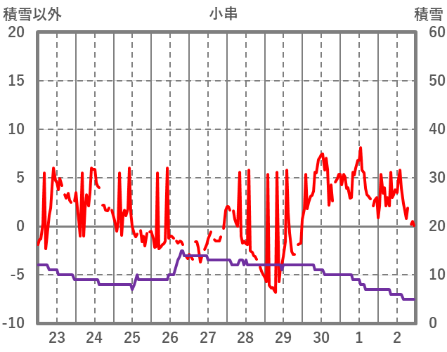 | 日 | 時 | 気温 | 降水 | 風向/風速 | 日照 | 積雪 | 降雪 |