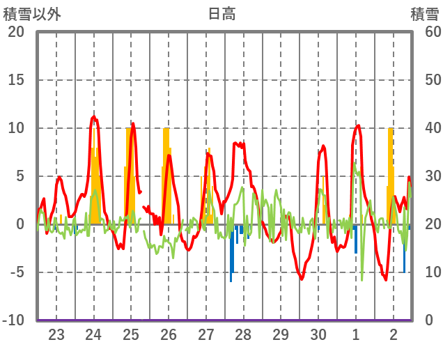 | 日 | 時 | 気温 | 降水 | 風向/風速 | 日照 | 積雪 | 降雪 |
