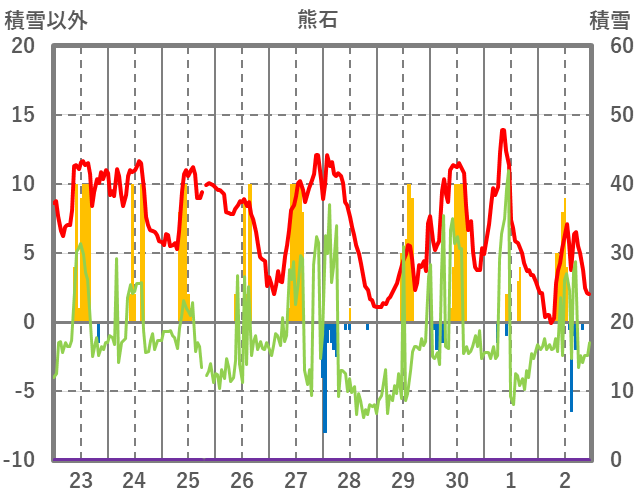 | 日 | 時 | 気温 | 降水 | 風向/風速 | 日照 | 積雪 | 降雪 |
