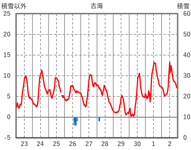| 日 | 時 | 気温 | 降水 | 風向/風速 | 日照 | 積雪 | 降雪 |