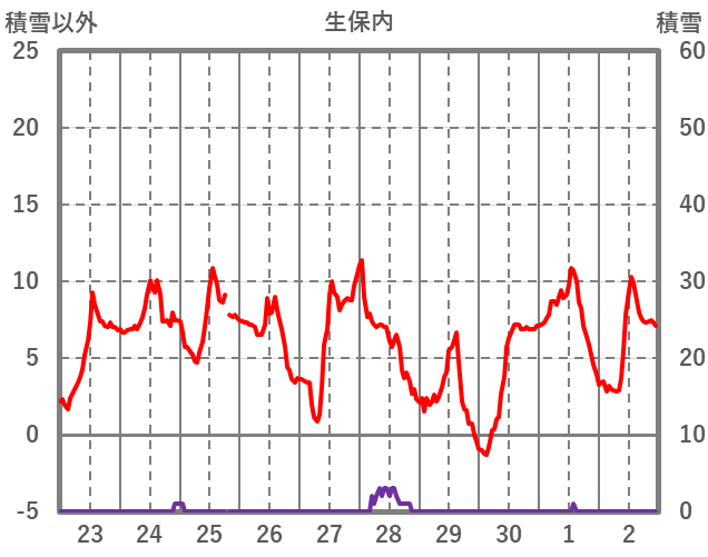 | 日 | 時 | 気温 | 降水 | 風向/風速 | 日照 | 積雪 | 降雪 |