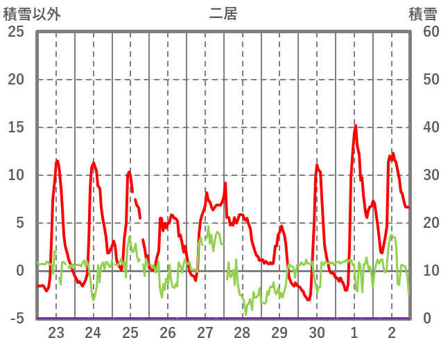 | 日 | 時 | 気温 | 降水 | 風向/風速 | 日照 | 積雪 | 降雪 |