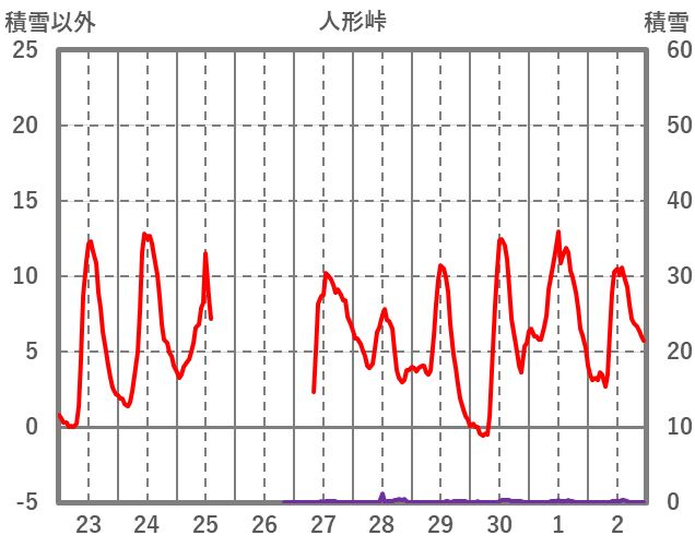 | 日 | 時 | 気温 | 降水 | 風向/風速 | 日照 | 積雪 | 降雪 |