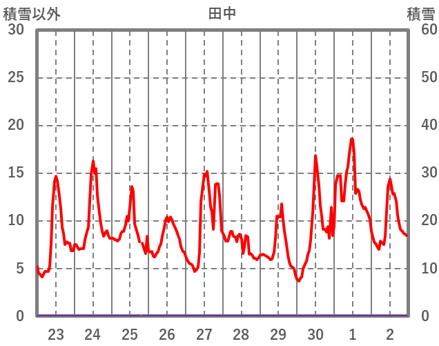 | 日 | 時 | 気温 | 降水 | 風向/風速 | 日照 | 積雪 | 降雪 |