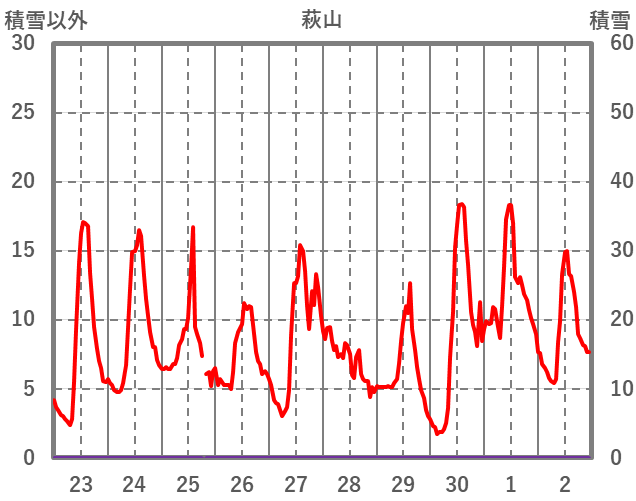 | 日 | 時 | 気温 | 降水 | 風向/風速 | 日照 | 積雪 | 降雪 |