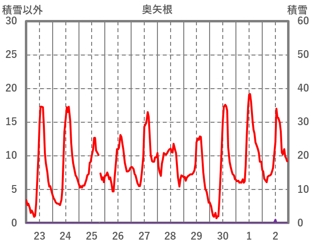 | 日 | 時 | 気温 | 降水 | 風向/風速 | 日照 | 積雪 | 降雪 |