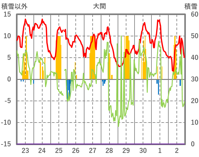 | 日 | 時 | 気温 | 降水 | 風向/風速 | 日照 | 積雪 | 降雪 |