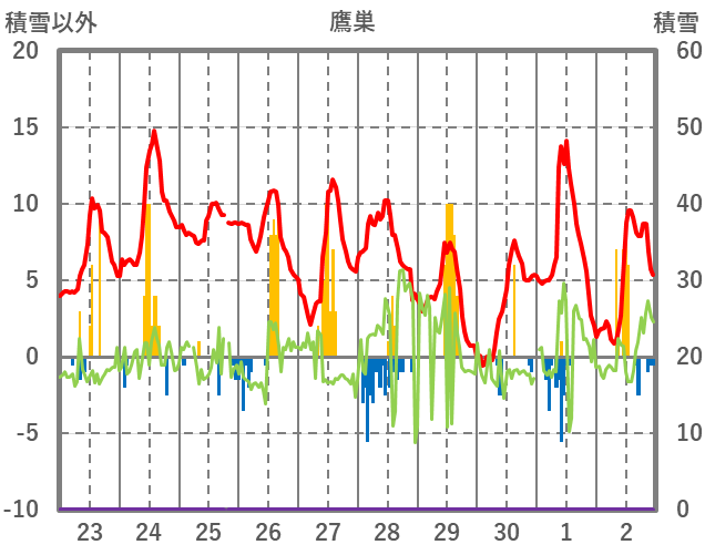 | 日 | 時 | 気温 | 降水 | 風向/風速 | 日照 | 積雪 | 降雪 |