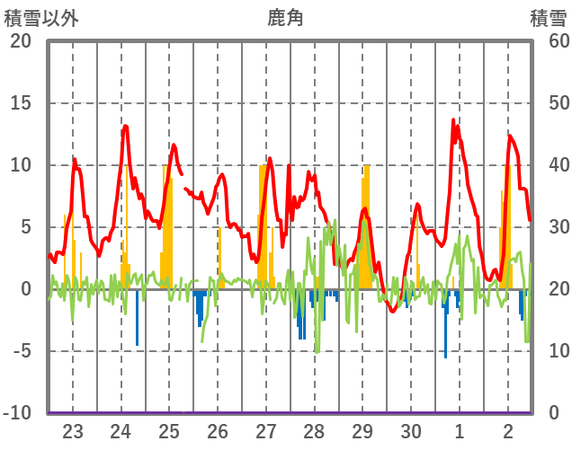 | 日 | 時 | 気温 | 降水 | 風向/風速 | 日照 | 積雪 | 降雪 |