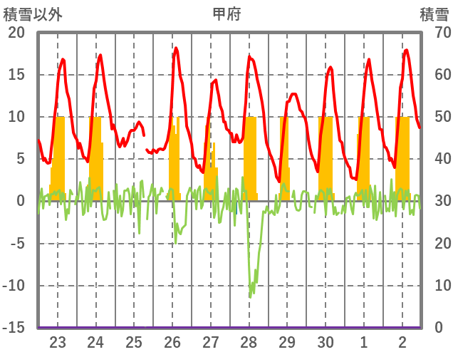 | 日 | 時 | 気温 | 降水 | 風向/風速 | 日照 | 積雪 | 降雪 |