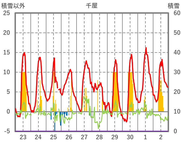 | 日 | 時 | 気温 | 降水 | 風向/風速 | 日照 | 積雪 | 降雪 |
