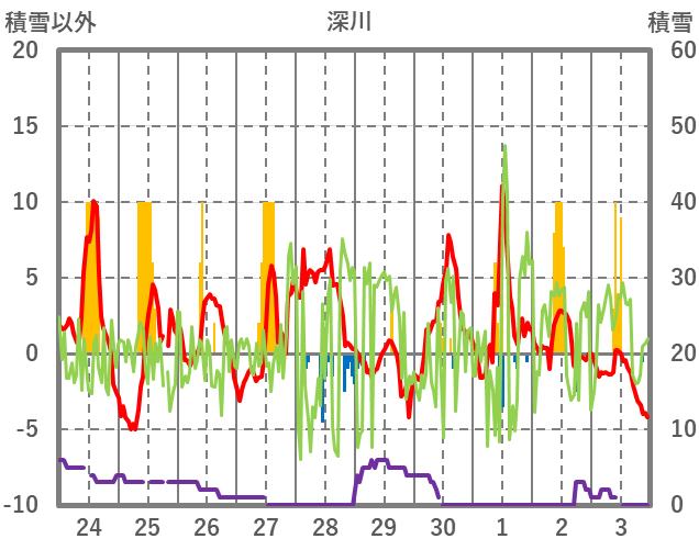 | 日 | 時 | 気温 | 降水 | 風向/風速 | 日照 | 積雪 | 降雪 |