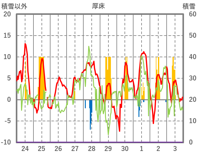 | 日 | 時 | 気温 | 降水 | 風向/風速 | 日照 | 積雪 | 降雪 |