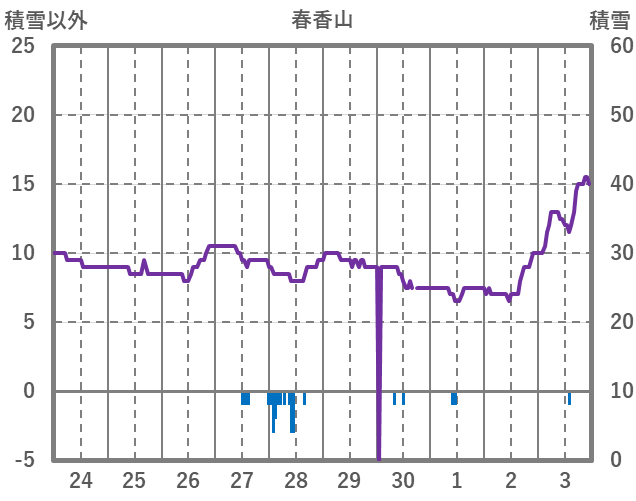 | 日 | 時 | 気温 | 降水 | 風向/風速 | 日照 | 積雪 | 降雪 |
