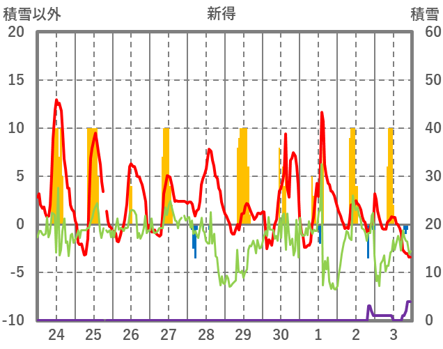| 日 | 時 | 気温 | 降水 | 風向/風速 | 日照 | 積雪 | 降雪 |