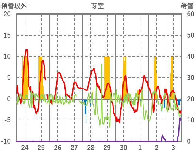 | 日 | 時 | 気温 | 降水 | 風向/風速 | 日照 | 積雪 | 降雪 |