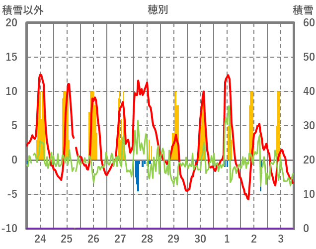 | 日 | 時 | 気温 | 降水 | 風向/風速 | 日照 | 積雪 | 降雪 |
