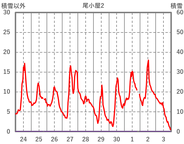 | 日 | 時 | 気温 | 降水 | 風向/風速 | 日照 | 積雪 | 降雪 |