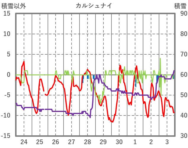| 日 | 時 | 気温 | 降水 | 風向/風速 | 日照 | 積雪 | 降雪 |