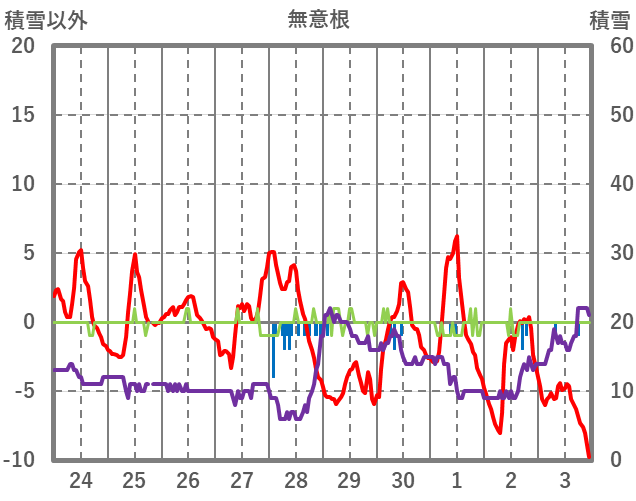 | 日 | 時 | 気温 | 降水 | 風向/風速 | 日照 | 積雪 | 降雪 |
