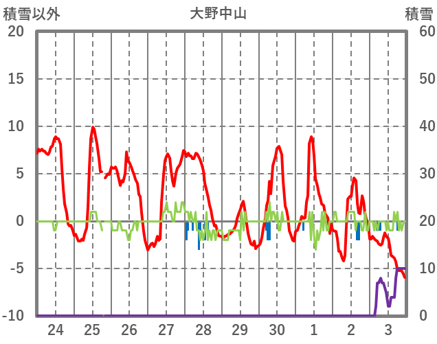 | 日 | 時 | 気温 | 降水 | 風向/風速 | 日照 | 積雪 | 降雪 |