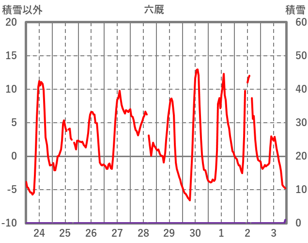 | 日 | 時 | 気温 | 降水 | 風向/風速 | 日照 | 積雪 | 降雪 |