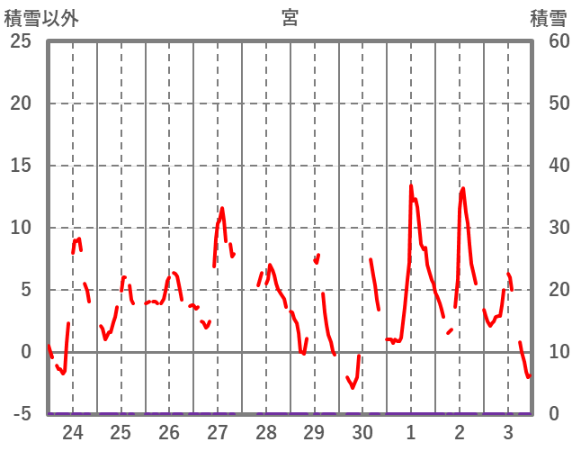 | 日 | 時 | 気温 | 降水 | 風向/風速 | 日照 | 積雪 | 降雪 |