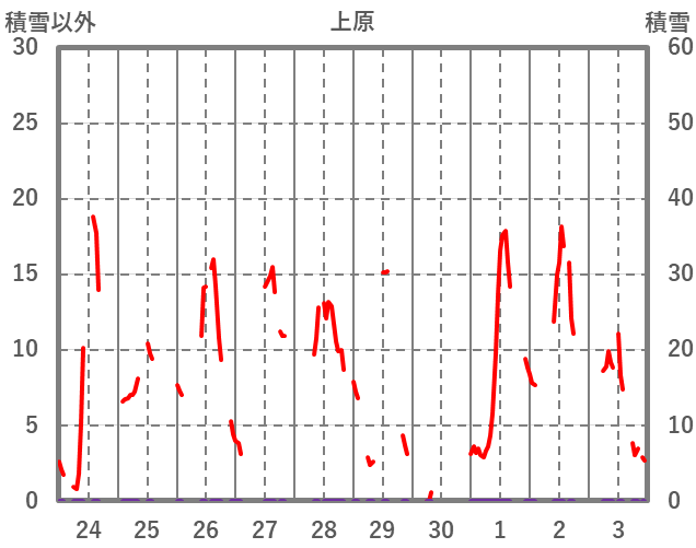 | 日 | 時 | 気温 | 降水 | 風向/風速 | 日照 | 積雪 | 降雪 |