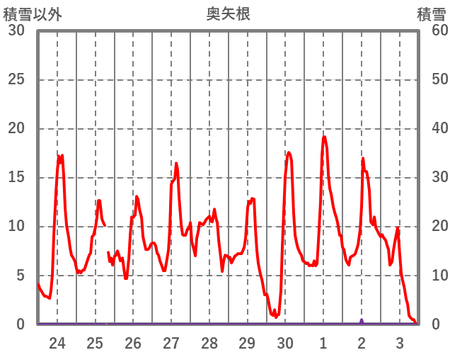 | 日 | 時 | 気温 | 降水 | 風向/風速 | 日照 | 積雪 | 降雪 |