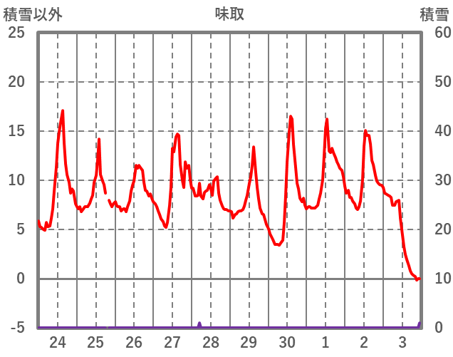 | 日 | 時 | 気温 | 降水 | 風向/風速 | 日照 | 積雪 | 降雪 |