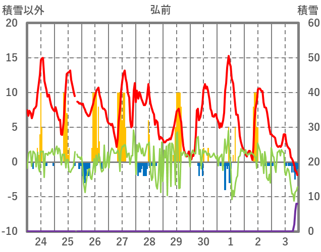 | 日 | 時 | 気温 | 降水 | 風向/風速 | 日照 | 積雪 | 降雪 |