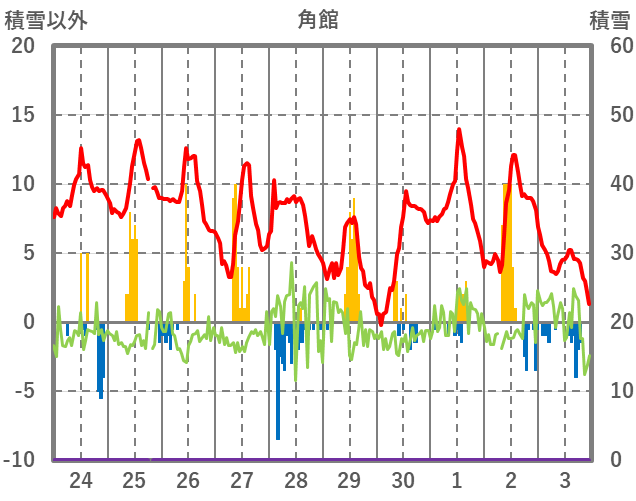 | 日 | 時 | 気温 | 降水 | 風向/風速 | 日照 | 積雪 | 降雪 |